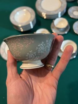 Mint Condition Castleton’s “Lace” China Set, White & Pink Cherry Blossoms Backed By A Flat Gray And Lined With Platinum $150Duluth, GA
