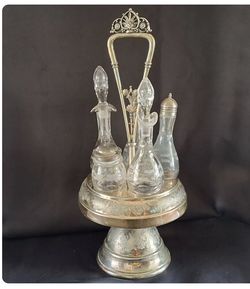 Antique Silverplate Cruet Castor Set Etched Glass Bottles 5 Piece Stand$175Los Angeles, CA