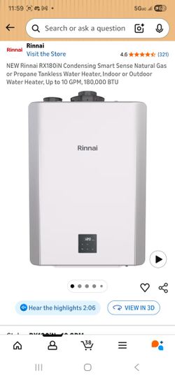 Rinnai Tankless Hotwater Heater 180btu$1,000Mercer Island, WA