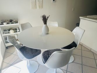 Round table 47 inch high gloss lacquer high quality and 5 dining chairs, lacquer, swivel, cushions are removable and washable. $1,150Burbank, CA