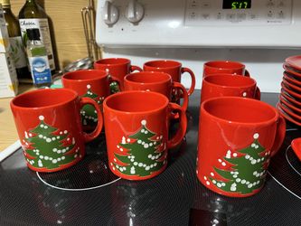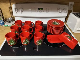 Red Waechtersbach Christmas Tree Pattern Mugs, Plates, Bowls, Butter, Dish, Thermal, And Salt Shaker$85Richardson, TX