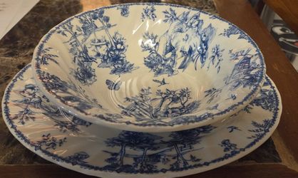 Churchill England Blue and White Ironstone Serving Set - Platter & Large Bowl - Toile Country Scene