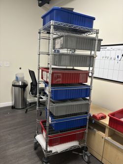 Sturdy ULINE rolling wire shelving unit. Has multiple shelves and comes with a bunch of blue, red, and gray plastic $100Santa Clarita, CA