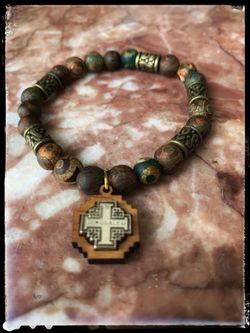 Men’s striped amber wood beads bracelet with Holy Land cross$14Plano, TX