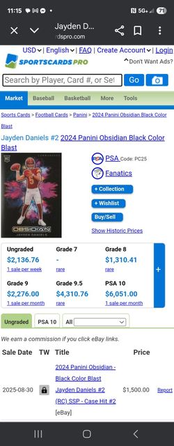 2024 Panini Obaidian SSP Jayden Daniels Rookie Card$2,000Portage, MI