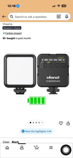 ULANZI VL49 2000mAh LED Video Light w 3 Cold Shoe, Rechargeable Soft Light Panel$15Arcadia, CA
