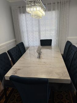 Value City Solid Marble Dining Table With 8 Velvet Blue Chairs$1,000Sully Station, VA