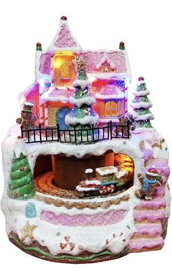 MOMENTS IN TIME 9”H LED Musical Gingerbread Train Station Animated Train Christmas Village Light Up Polyresin Holiday Decoration Battery or Adapter Op$80Ontario, CA