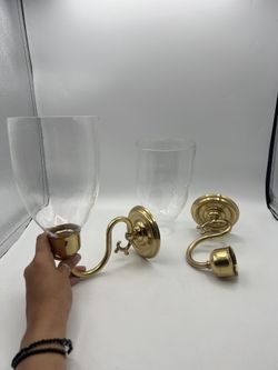 Vtg Pair of 1989 Solid Brass Korea Wall Sconce Candleholders w/Hurricane Glass$75Westminster, CA