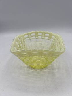 SoldFenton Basket Weave Yellow Vaseline Uranium Opalescent Square Glass Bowl Vase$40Westminster, CA