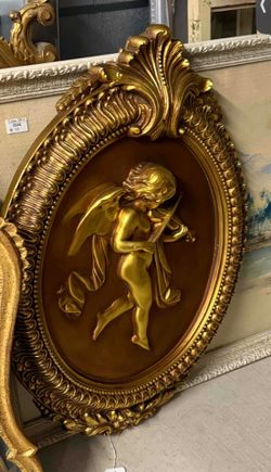 Gilded relief cherub playing violin wall plaque in ornate frame.$40Puyallup, WA