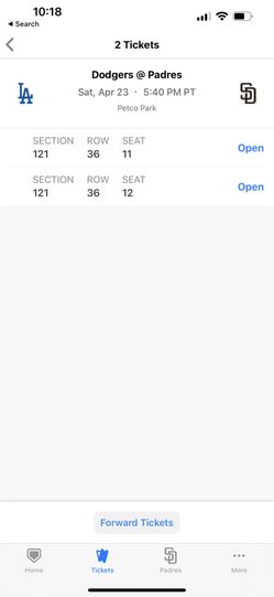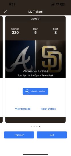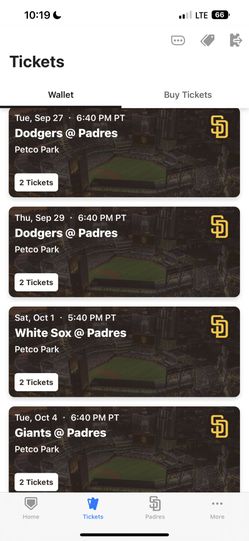Sep 29th Member Tickets. Padres Vs Dodgers. Section 121, Row 36, Seats 11,12$360San Diego, CA