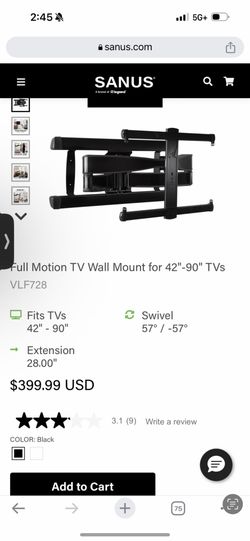 SANUS Elite - Advanced Full-Motion TV Wall Mount for Most 42"-90" TVs up to 125 Ibs - Tilts, Swivels, and Extends up to 28" From Wall - Black Brushed $175Dillsburg, PA