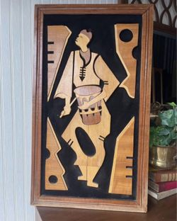 Mid-Century Folk Art Hand Carved Wood Frames Plaque Drummer Man On Black Velvet$55Dearborn, MI