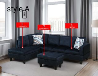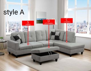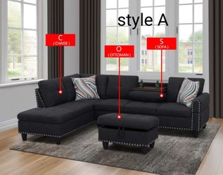 Black Grey Linen 3 Seater Sectional Sofa Set With Ottoman $560Monroe Township, NJ
