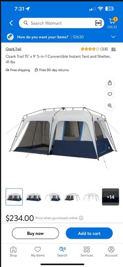 Ozark Trail 15’ x 9’ 5-in-1 Convertible Instant Tent and Shelter, 41 lbs$220Lake Forest, CA