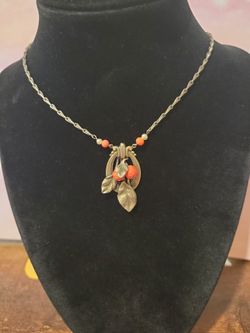 Art Deco Antique Style Carved Celluloid Faux Coral Rose Leaf Motif Pendant Bronzetone 17" Necklace F9$25Diamond Bar, CA