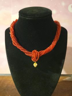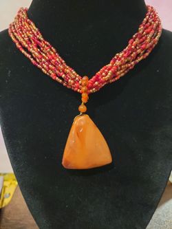 Woman's Multistrand Red And Gold Seed Beaded 18" Necklace Orange Agate Triangle Shape Pendant F9$25Diamond Bar, CA