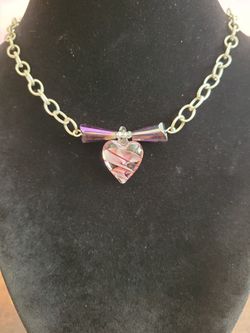 Handblown Glass Purple Swirl Puff Heart on Silvertone Chain Necklace 18.5" F9 $17Diamond Bar, CA