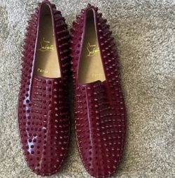 Christian Louboutin Roller-Boat slip-on sneaker in a dark red patent leather with tonal spikes. $400New York, NY