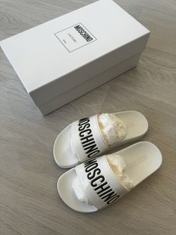 Moschino Pool Slides White & Black Logo $150Hackensack, NJ