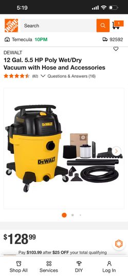 DEWALT 12 Gal. 5.5 HP Poly Wet/Dry Vacuum with Hose and Accessories$100Temecula, CA