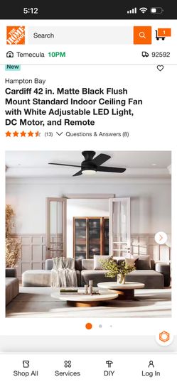 Hampton Bay Cardiff 42 in. Matte Black Flush Mount Standard Indoor Ceiling Fan with White Adjustable$40Temecula, CA