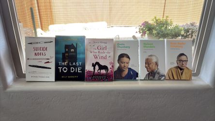 6 books, suicide notes by Michael Thomas Ford, the last to die by Kelly Garrett, the girl who wrote the wind by Stacy Greg, Greta Thungberg, Nelson Ma$3Sun City, AZ
