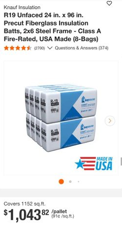 50% OFF - Knauf R19 Unfaced Fiberglass Insulation 24×96 Batts 2x6 Steel Frame - 8 Bags$520Glendale, AZ