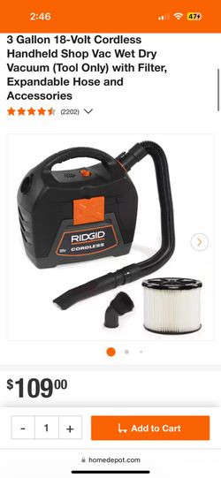 3 Gallon 18-Volt Cordless Handheld Shop Vac Wet Dry Vacuum (Tool Only) with Filter, Expandable Hose and Accessories$80Youngsville, NC