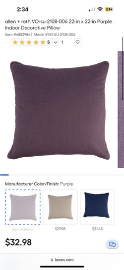 allen + roth VO-su-2108-006 22-in x 22-in Purple Indoor Decorative Pillow$15Youngsville, NC