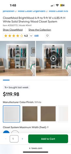 ClosetMaid BrightWood 4-ft to 9-ft W x 6.85-ft H White Solid Shelving Wood Closet System$100Youngsville, NC