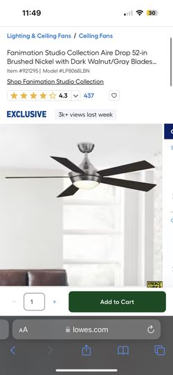 Fanimation Studio Collection Aire Drop 52-in Brushed Nickel with Dark Walnut/Gray Blades Integrated LED Indoor Ceiling Fan with Light and Remote (5-Bl$80Youngsville, NC