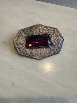 vintage-style metal brooch with a floral design and a large, amethyst gemstone.$105Chula Vista, CA