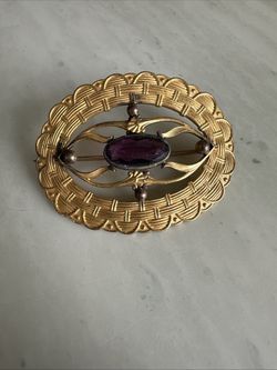 Vintage gold tone oval brooch w/ a central purple stone & ornate design$102Chula Vista, CA