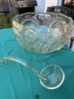 Pressed glass Bowl, H8.5”, Diameter 12.5”. Comes with a glass ladle. Both in excellent condition. $30Boca Raton, FL