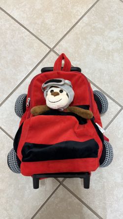 Red car luggage with attached monkey toy and wheel design.$20Gaithersburg, MD