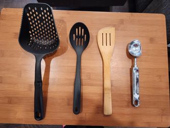 4 various kitchen utensils, a large strainer, a slotted spoon, a bamboo slotted spatula, and an ice cream scoop, good condition $3Parker, CO