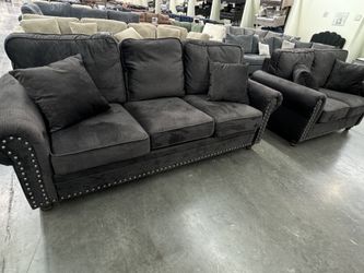 2 pc dark coffee velvet sofa and love seat set with nail head trim and rounded arms $725Long Beach, CA