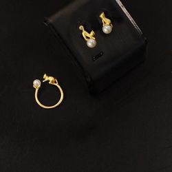 Kitty Cat Ring Stud Earrings Set Gold Toned Pearl Beads$20Milpitas, CA