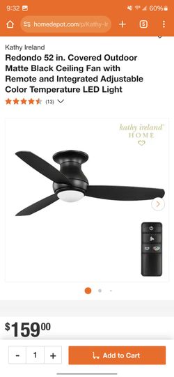 Kathy Ireland Redondo 52 in. Covered Outdoor Matte Black Ceiling Fan with Remote and Integrated Adjustable Color Temperature LED Light$120Gilbert, AZ