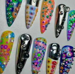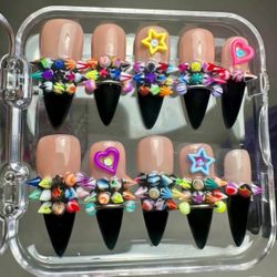 Y2K Press On Nails: Black French Tip with Colorful Charms and Piercings (Size Medium)$75Tracy, CA