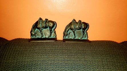 Vintage 2 Cast Iron Metal Grazing Horses Saddled Bronze Brass Finish Bookends