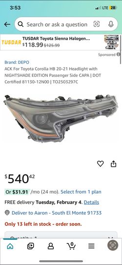 ACK For Toyota Corolla HB 20-21 Headlight with NIGHTSHADE EDITION Passenger Side CAPA | DOT Certified 81130-12N00 | TO(contact info removed)C$130El Monte, CA