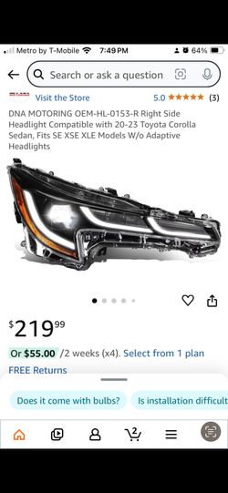 DNA MOTORING OEM-HL-0153-R Right Side Headlight Compatible with 20-23 Toyota Corolla Sedan, Fits SE XSE XLE Models W/o Adaptive Headlights$150El Monte, CA
