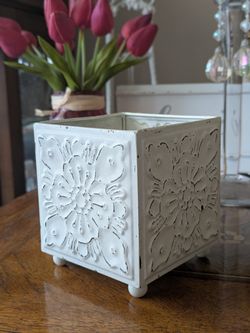 French Inspired White Distressed Metal Cachepot~Embossed Floral Motifs 4"x4"$12Placentia, CA