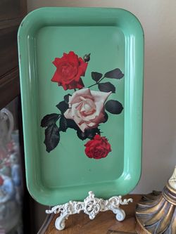 Vintage Mid Century Green Metal Lap/Serving Tray~Floral Rose Motif~14" x 9"$12Placentia, CA