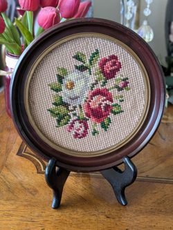 Vintage Round Floral Needlepoint Wall Art Framed Roses 7" Diameter Cottage Decor$25Placentia, CA