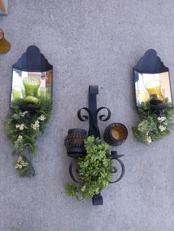 2 Mirrored Sconces w/candle holders & Wrought Iron decorative Sconce w/ 2 gold colored Glass candle Holders$30El Cajon, CA
