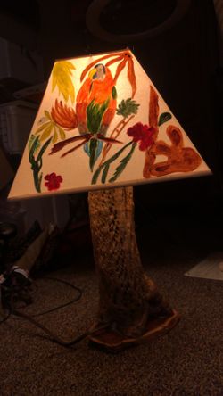 VINTAGE HAND PAINTED PARROT SHADE W/STUNNING DRIFTWOOD BASE ON A SLAB OF HARDWOOD $40Vancouver, WA
